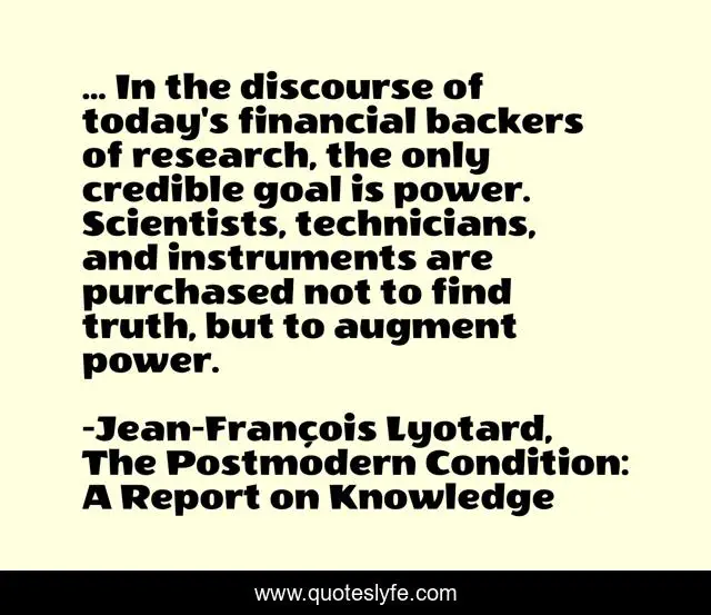 This page presents the quote "... In the discourse of today's financial backers of research, the only credible goal is power. Scientists, technicians, and instruments are purchased not to find truth, but to augment power.". Author of this quote is Jean-François Lyotard, The Postmodern Condition: A Report on Knowledge. This quote is about science, bias, wealth, knowledge, corruption,.