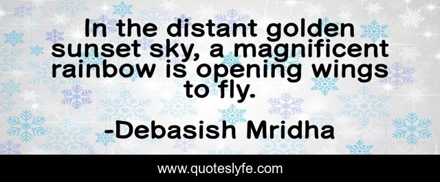 This page presents the quote "In the distant golden sunset sky, a magnificent rainbow is opening wings to fly.". Author of this quote is Debasish Mridha. This quote is about philosophy, debasish-mridha, magnificent-rainbow, quotes, debasish-mridha-md, inspirational, golden-sunset, enthusiasm, wings-to-fly,.