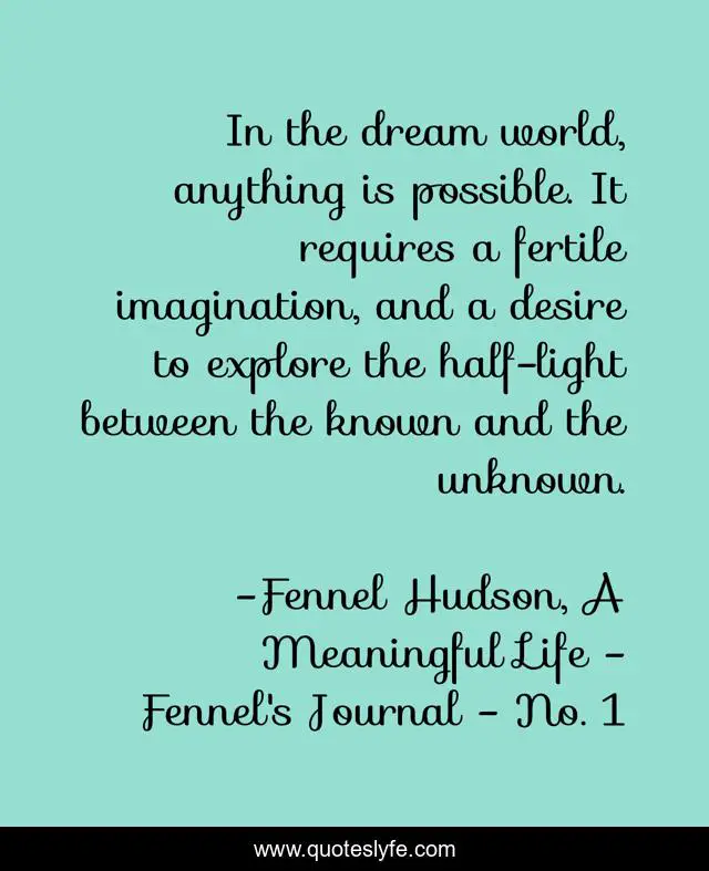 This page presents the quote "In the dream world, anything is possible. It requires a fertile imagination, and a desire to explore the half-light between the known and the unknown.". Author of this quote is Fennel Hudson, A Meaningful Life - Fennel's Journal - No. 1. This quote is about dream-world, dreams, imagination,.