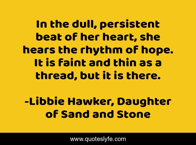 This page presents the quote "In the dull, persistent beat of her heart, she hears the rhythm of hope. It is faint and thin as a thread, but it is there.". Author of this quote is Libbie Hawker, Daughter of Sand and Stone. This quote is about heart, hope-and-despair, thin-as-a-thread, libbie-hawker, heartbeat, hope, zenobia,.