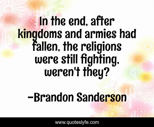 This page presents the quote "In the end, after kingdoms and armies had fallen, the religions were still fighting, weren't they?". Author of this quote is Brandon Sanderson. .
