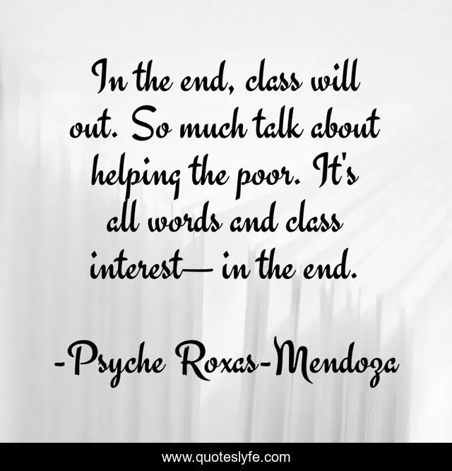 This page presents the quote "In the end, class will out. So much talk about helping the poor. It's all words and class interest— in the end.". Author of this quote is Psyche Roxas-Mendoza. This quote is about helping, poor, class, words, class-interest,.