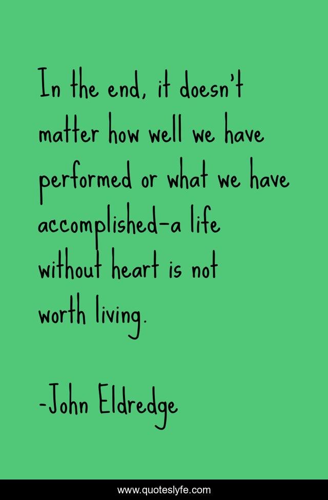 This page presents the quote "In the end, it doesn’t matter how well we have performed or what we have accomplished—a life without heart is not worth living.". Author of this quote is John Eldredge. .