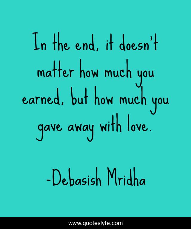 This page presents the quote "In the end, it doesn't matter how much you earned, but how much you gave away with love.". Author of this quote is Debasish Mridha. This quote is about life, love, knowledge, inspirational, intelligence, philosophy, wisdom, quotes, affection,.