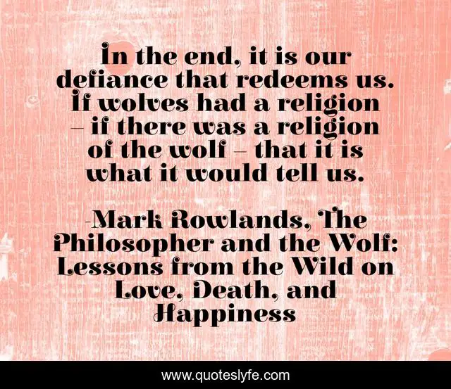 This page presents the quote "In the end, it is our defiance that redeems us. If wolves had a religion – if there was a religion of the wolf – that it is what it would tell us.". Author of this quote is Mark Rowlands, The Philosopher and the Wolf: Lessons from the Wild on Love, Death, and Happiness. This quote is about heart, inspiring, animal, philosophy, wolf, learning, defiance, redemption,.