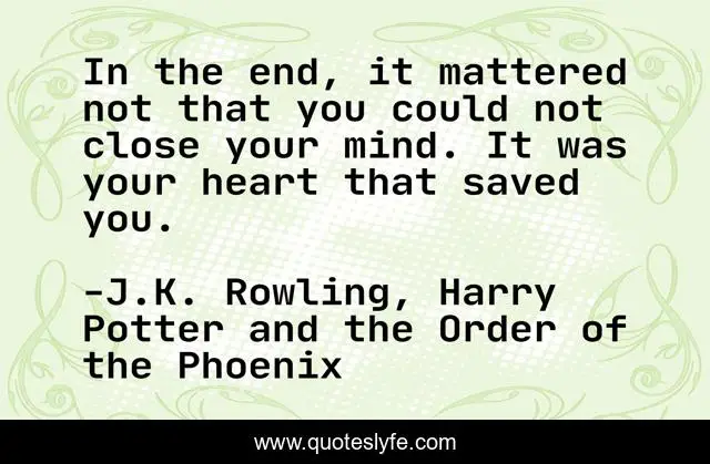 This page presents the quote "In the end, it mattered not that you could not close your mind. It was your heart that saved you.". Author of this quote is J.K. Rowling, Harry Potter and the Order of the Phoenix. This quote is about heart, mind,.