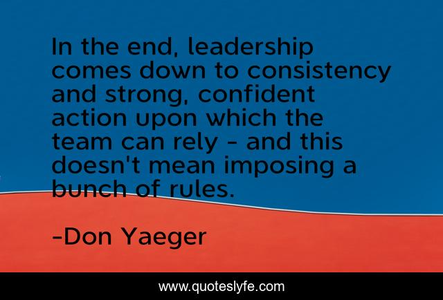 This page presents the quote "In the end, leadership comes down to consistency and strong, confident action upon which the team can rely - and this doesn't mean imposing a bunch of rules.". Author of this quote is Don Yaeger. This quote is about rules, strong, team,.