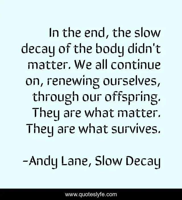 This page presents the quote "In the end, the slow decay of the body didn't matter. We all continue on, renewing ourselves, through our offspring. They are what matter. They are what survives.". Author of this quote is Andy Lane, Slow Decay. This quote is about aging, death, children,.