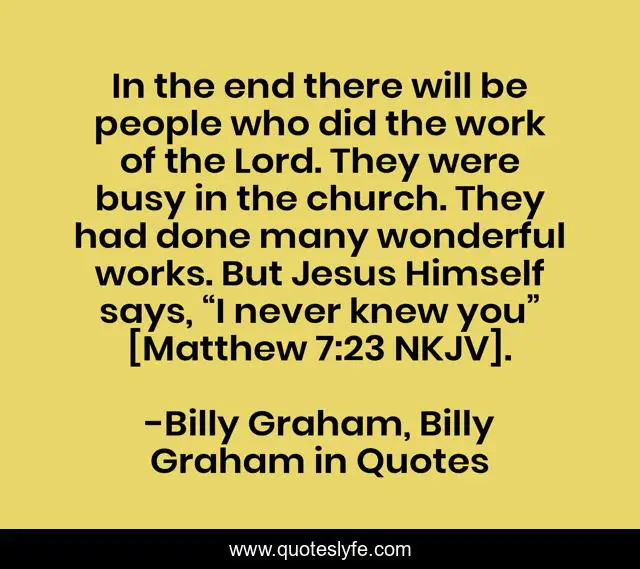 In the end there will be people who did the work of the Lord. They were busy in the church. They had done many wonderful works. But Jesus Himself says, “I never knew you” [Matthew 7:23 NKJV].