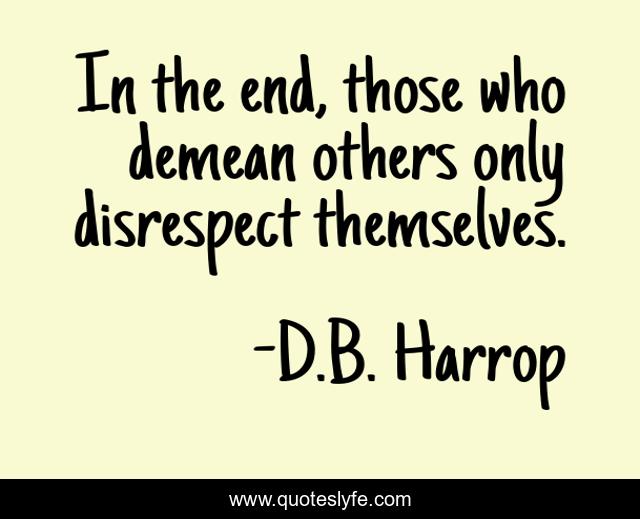 This page presents the quote "In the end, those who demean others only disrespect themselves.". Author of this quote is D.B. Harrop. This quote is about respecting-others, respecting-yourself, behavior, life-lessons, thoughts-on-life,.