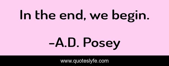 This page presents the quote "In the end, we begin.". Author of this quote is A.D. Posey. This quote is about begin, end, storytelling, we, storytellers, story, writing, write, writers,.