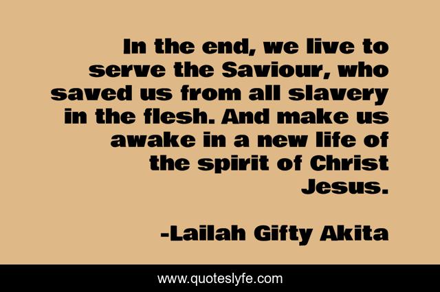 This page presents the quote "In the end, we live to serve the Saviour, who saved us from all slavery in the flesh. And make us awake in a new life of the spirit of Christ Jesus.". Author of this quote is Lailah Gifty Akita. This quote is about jesus-christ, christian, slavery, sin, saviour, new-life, salvation, spirit,.