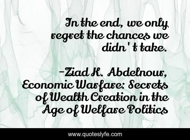 This page presents the quote "In the end, we only regret the chances we didn't take.". Author of this quote is Ziad K. Abdelnour, Economic Warfare: Secrets of Wealth Creation in the Age of Welfare Politics. This quote is about chances, regret,.