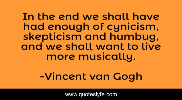 This page presents the quote "In the end we shall have had enough of cynicism, skepticism and humbug, and we shall want to live more musically.". Author of this quote is Vincent van Gogh. .