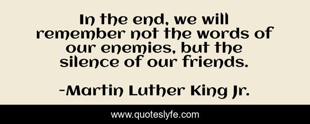 This page presents the quote "In the end, we will remember not the words of our enemies, but the silence of our friends.". Author of this quote is Martin Luther King Jr.. This quote is about enthusiasm, inspirational,.