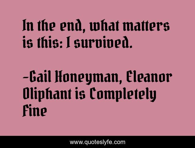 This page presents the quote "In the end, what matters is this: I survived.". Author of this quote is Gail Honeyman, Eleanor Oliphant is Completely Fine. This quote is about things-that-matter, survival, i-m-still-here,.