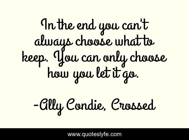 This page presents the quote "In the end you can't always choose what to keep. You can only choose how you let it go.". Author of this quote is Ally Condie, Crossed. This quote is about enthusiasm, inspirational,.