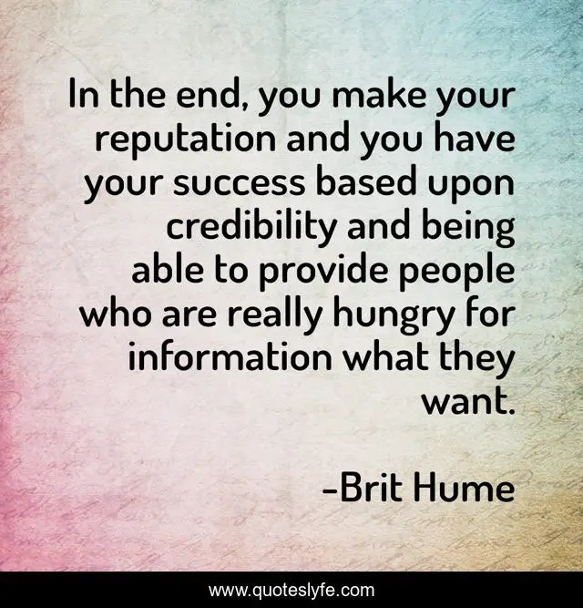 This page presents the quote "In the end, you make your reputation and you have your success based upon credibility and being able to provide people who are really hungry for information what they want.". Author of this quote is Brit Hume. This quote is about information, end, people,.