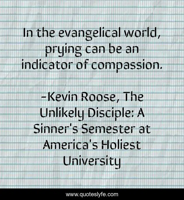 This page presents the quote "In the evangelical world, prying can be an indicator of compassion.". Author of this quote is Kevin Roose, The Unlikely Disciple: A Sinner's Semester at America's Holiest University. This quote is about compassion, evangelism,.