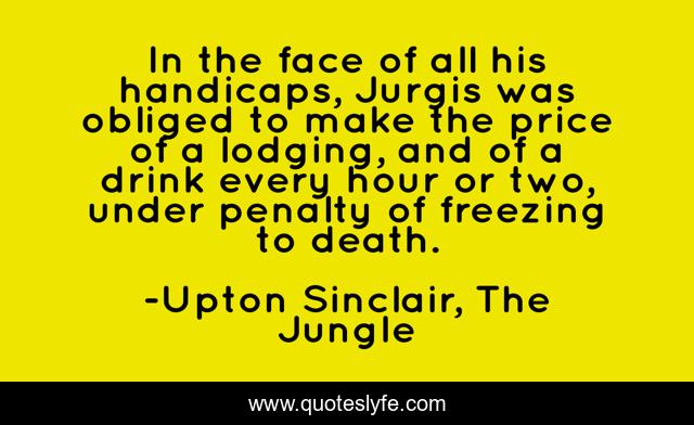 This page presents the quote "In the face of all his handicaps, Jurgis was obliged to make the price of a lodging, and of a drink every hour or two, under penalty of freezing to death.". Author of this quote is Upton Sinclair, The Jungle. This quote is about historical-fiction, classic-literature, immigrant-experience,.