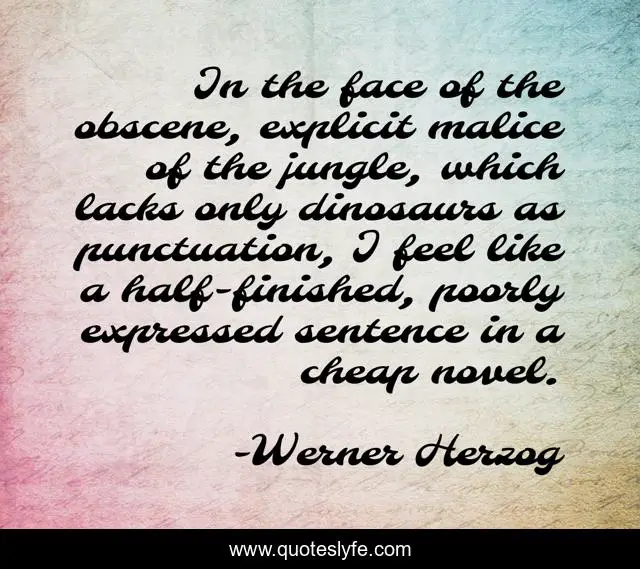 This page presents the quote "In the face of the obscene, explicit malice of the jungle, which lacks only dinosaurs as punctuation, I feel like a half-finished, poorly expressed sentence in a cheap novel.". Author of this quote is Werner Herzog. .