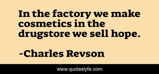 This page presents the quote "In the factory we make cosmetics in the drugstore we sell hope.". Author of this quote is Charles Revson. This quote is about sell, drugstore, factory,.
