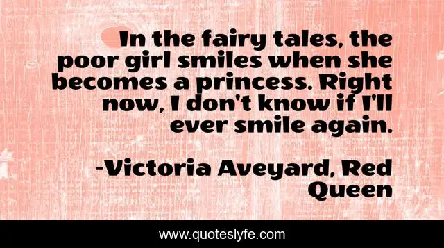This page presents the quote "In the fairy tales, the poor girl smiles when she becomes a princess. Right now, I don't know if I'll ever smile again.". Author of this quote is Victoria Aveyard, Red Queen. This quote is about smile, happiness,.