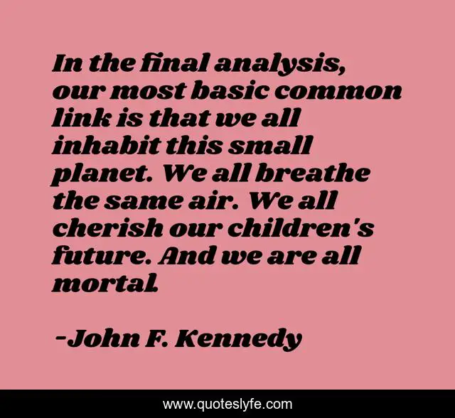 This page presents the quote "In the final analysis, our most basic common link is that we all inhabit this small planet. We all breathe the same air. We all cherish our children's future. And we are all mortal.". Author of this quote is John F. Kennedy. This quote is about breathe, analysis, air, children-future, mortal, common-link, mortality,.