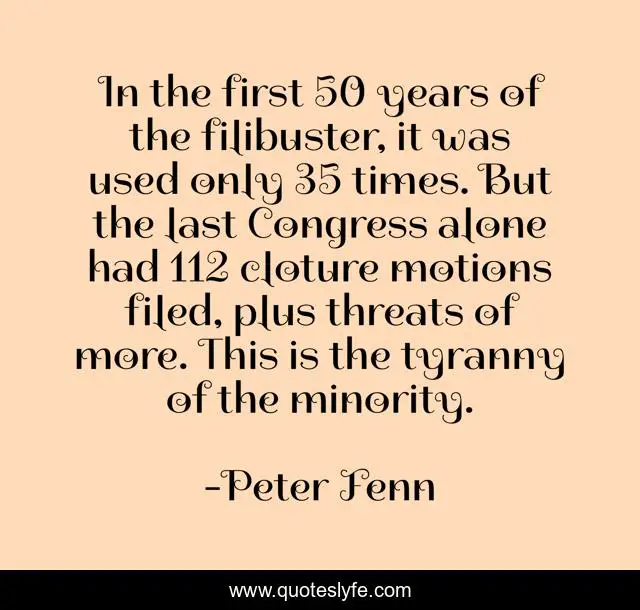 This page presents the quote "In the first 50 years of the filibuster, it was used only 35 times. But the last Congress alone had 112 cloture motions filed, plus threats of more. This is the tyranny of the minority.". Author of this quote is Peter Fenn. This quote is about tyranny, first, years,.