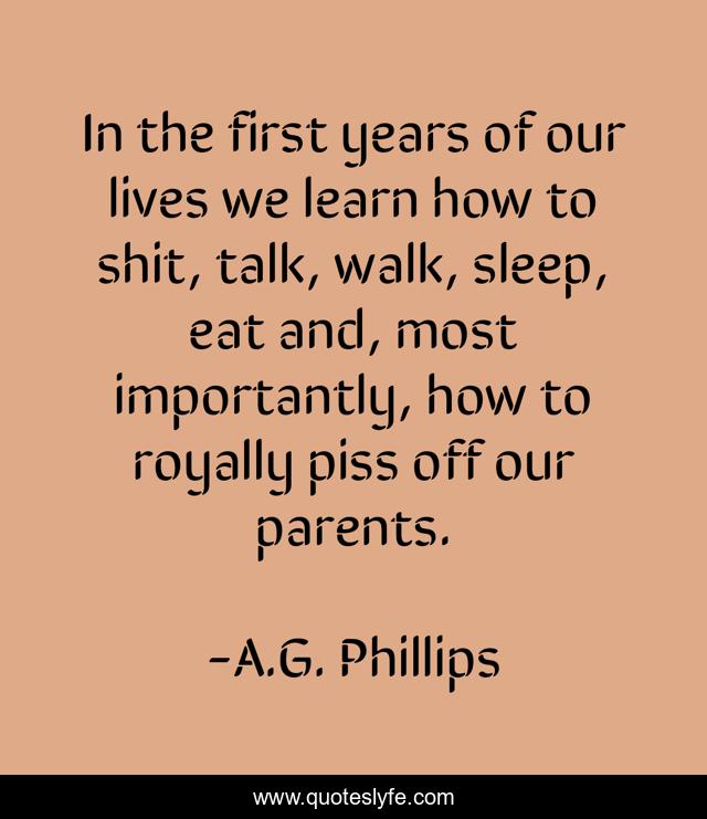 This page presents the quote "In the first years of our lives we learn how to shit, talk, walk, sleep, eat and, most importantly, how to royally piss off our parents.". Author of this quote is A.G. Phillips. This quote is about humor, mind, psychology,.