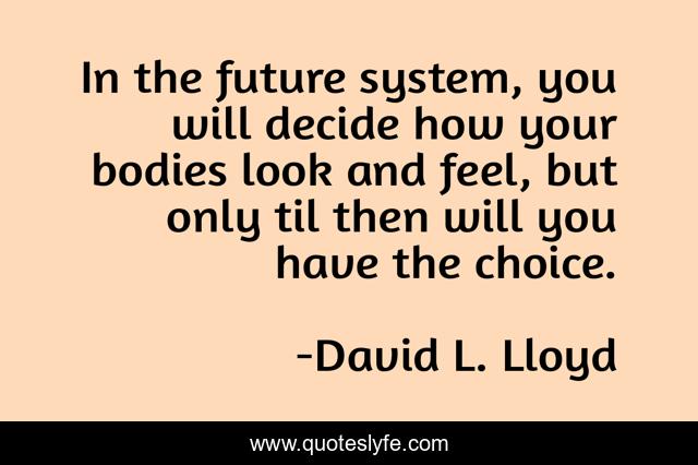 This page presents the quote "In the future system, you will decide how your bodies look and feel, but only til then will you have the choice.". Author of this quote is David L. Lloyd. This quote is about knowledge, human-nature, science, humanity, wisdom, satan, new-world-order, truth, universe,.