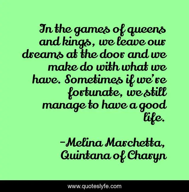 This page presents the quote "In the games of queens and kings, we leave our dreams at the door and we make do with what we have. Sometimes if we’re fortunate, we still manage to have a good life.". Author of this quote is Melina Marchetta, Quintana of Charyn. This quote is about loss, rulership, lives, kings, dreams, queens,.