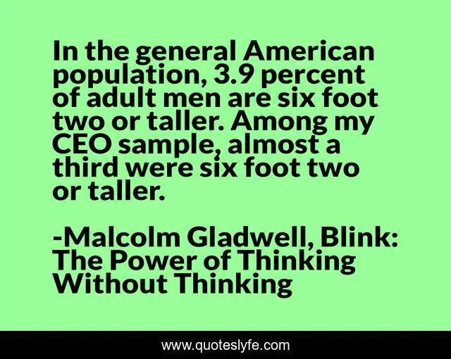 This page presents the quote "In the general American population, 3.9 percent of adult men are six foot two or taller. Among my CEO sample, almost a third were six foot two or taller.". Author of this quote is Malcolm Gladwell, Blink: The Power of Thinking Without Thinking. This quote is about appearance, assumptions, prejudice,.