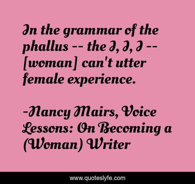 "Nancy Mairs, Voice Lessons: On Becoming a (Woman) Writer Quotes." Quoteslyfe.com, 2025. Sat. 06 Dec. 2025. <https://www.quoteslyfe.com/quote/In-the-grammar-of-the-phallus-the-101531>.