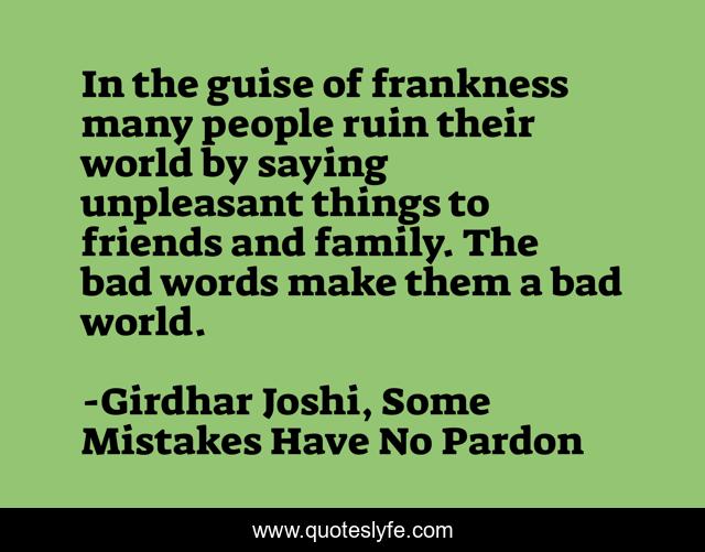 This page presents the quote "In the guise of frankness many people ruin their world by saying unpleasant things to friends and family. The bad words make them a bad world.". Author of this quote is Girdhar Joshi, Some Mistakes Have No Pardon. This quote is about frankness, words,.