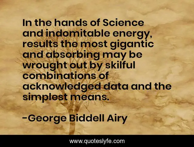 This page presents the quote "In the hands of Science and indomitable energy, results the most gigantic and absorbing may be wrought out by skilful combinations of acknowledged data and the simplest means.". Author of this quote is George Biddell Airy. This quote is about science, energy, data, results, skilful,.