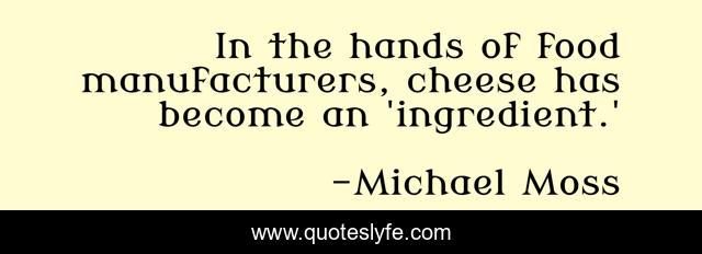 This page presents the quote "In the hands of food manufacturers, cheese has become an 'ingredient.'". Author of this quote is Michael Moss. This quote is about cheese, hands, become,.