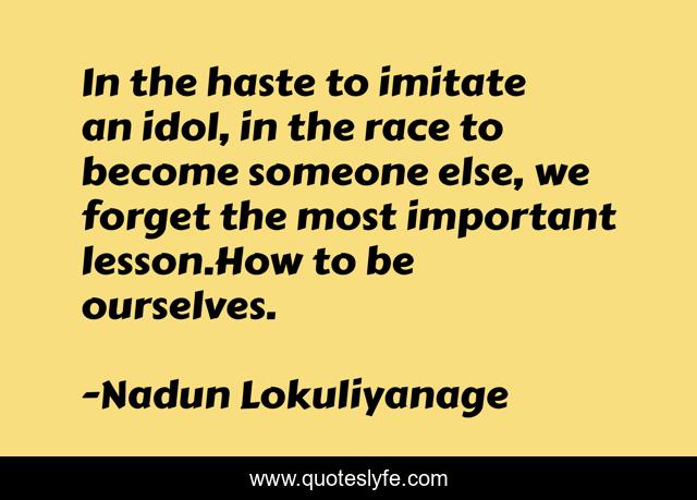 This page presents the quote "In the haste to imitate an idol, in the race to become someone else, we forget the most important lesson.How to be ourselves.". Author of this quote is Nadun Lokuliyanage. This quote is about lessons, life, life-and-living-insight, imitation,.