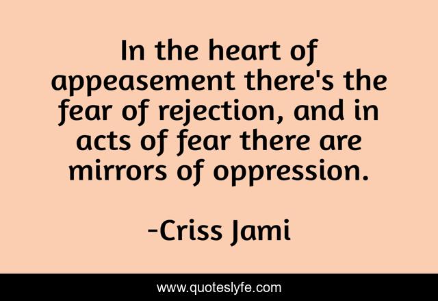 This page presents the quote "In the heart of appeasement there's the fear of rejection, and in acts of fear there are mirrors of oppression.". Author of this quote is Criss Jami. This quote is about appeasement, art, reflection, insecurity, oppression, slavery, failure, mirror, rejection,.