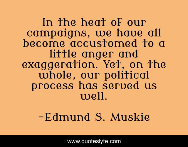 This page presents the quote "In the heat of our campaigns, we have all become accustomed to a little anger and exaggeration. Yet, on the whole, our political process has served us well.". Author of this quote is Edmund S. Muskie. This quote is about process, heat, political,.