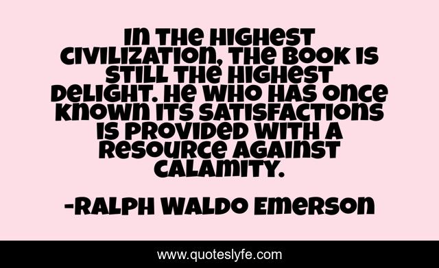 This page presents the quote "In the highest civilization, the book is still the highest delight. He who has once known its satisfactions is provided with a resource against calamity.". Author of this quote is Ralph Waldo Emerson. This quote is about quote, emerson, civilized, books, civilization, reading,.