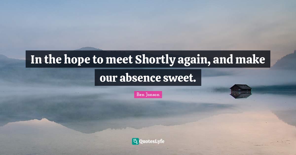 This page presents the quote "In the hope to meet Shortly again, and make our absence sweet.". Author of this quote is Ben Jonson. This quote is about love, absence, i miss you, sweet, missing you, hope,.