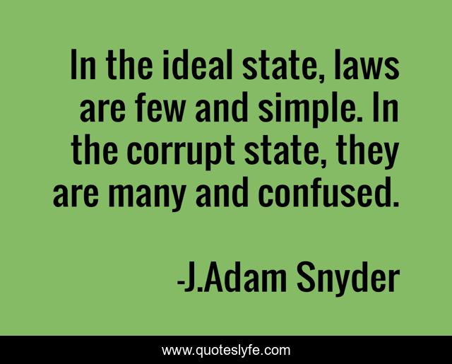 This page presents the quote "In the ideal state, laws are few and simple. In the corrupt state, they are many and confused.". Author of this quote is J.Adam Snyder. This quote is about rights, government, statehood, freedom, philosophy, liberty, politics, j-adam-snyder, laws,.