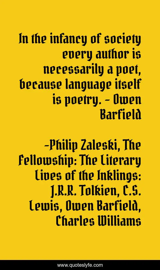 This page presents the quote "In the infancy of society every author is necessarily a poet, because language itself is poetry. – Owen Barfield". Author of this quote is Philip Zaleski, The Fellowship: The Literary Lives of the Inklings: J.R.R. Tolkien, C.S. Lewis, Owen Barfield, Charles Williams. This quote is about motivation, imagery, vocabulary, word-choice,.
