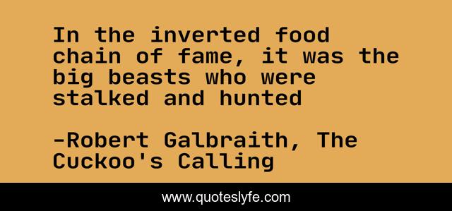 This page presents the quote "In the inverted food chain of fame, it was the big beasts who were stalked and hunted". Author of this quote is Robert Galbraith, The Cuckoo's Calling. This quote is about food-chain, fame,.
