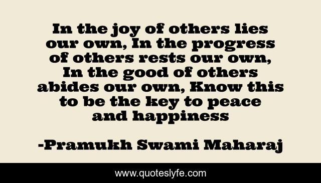 This page presents the quote "In the joy of others lies our own, In the progress of others rests our own, In the good of others abides our own, Know this to be the key to peace and happiness". Author of this quote is Pramukh Swami Maharaj. .