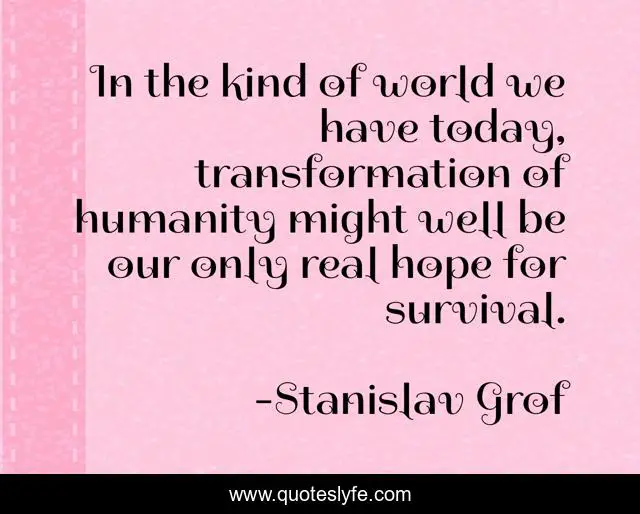This page presents the quote "In the kind of world we have today, transformation of humanity might well be our only real hope for survival.". Author of this quote is Stanislav Grof. This quote is about world, humanity, today,.