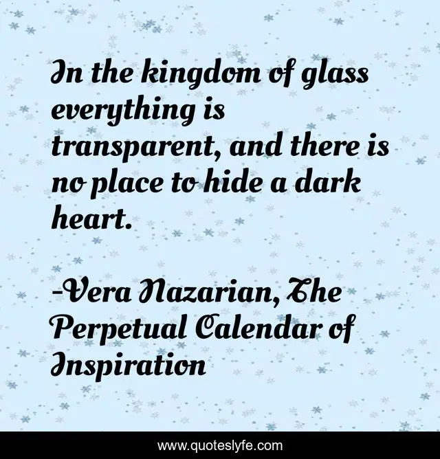 This page presents the quote "In the kingdom of glass everything is transparent, and there is no place to hide a dark heart.". Author of this quote is Vera Nazarian, The Perpetual Calendar of Inspiration. This quote is about kingdom, heart, hide, honesty, privacy, clear, honest, dark, glass,.