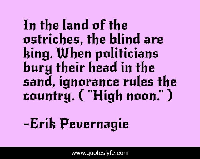 This page presents the quote "In the land of the ostriches, the blind are king. When politicians bury their head in the sand, ignorance rules the country. ( "High noon." )". Author of this quote is Erik Pevernagie. This quote is about blind, king, politicians, ignorance, sand, ostrich,.