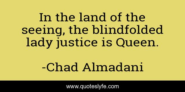 This page presents the quote "In the land of the seeing, the blindfolded lady justice is Queen.". Author of this quote is Chad Almadani. This quote is about justice, impartiality, truth,.